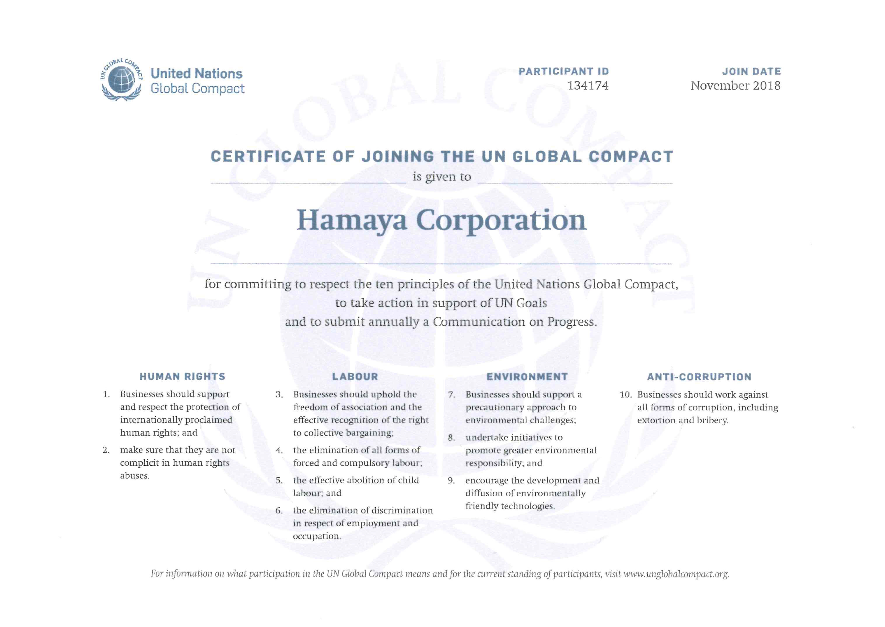 株式会社浜屋は、2018年11月、国際連合が提唱する「国連グローバル・コンパクト」(以下UNGC)へ署名し、参加企業として登録されるとともに、日本におけるローカルネットワークである「グローバル・コンパクト・ネットワーク・ジャパン」に加入いたしました。